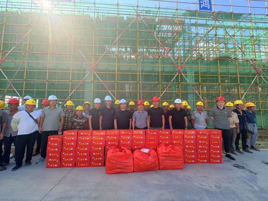 在庆丰禾项目施工现场,工人们正在高温下作业。志愿者们将防暑物资送到工人手上。乡党委主要负责同志叮嘱施工单位要合理安排工作时间,落实好防暑措施,并说明这份心意既是对大家的慰问,也是对大家劳动的敬意。工人们表示会继续努力,保障项目进度。