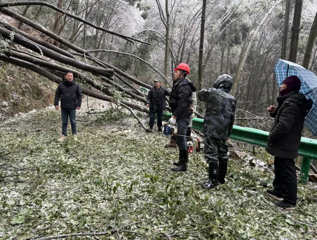 行动在先,争做安全出行“守护者”。以雪为令,方洲村第一时间组织村两委干部、村民组长、护林员等人员速度开展安全隐患排查和破冰除碍行动,为村民安全出行保驾护航。该村中线路及白龙路段受灾严重,志愿者们借助电锯、砍刀、铁锹等工具,大家分工明确、配合默契,对道路两旁压倒的树木、竹子、积雪等进行全面清理,经过大家的共同努力,辖区内清理出了一条条“安心路”。