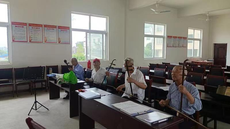 二胡声、歌声,声声入耳,刚走进观音村老年活动中心大门,就听到老年活动中心室内传来二胡声和山歌声。在老年活动室内,老人们正在对着曲谱拉二胡唱山歌,场面十分热闹。