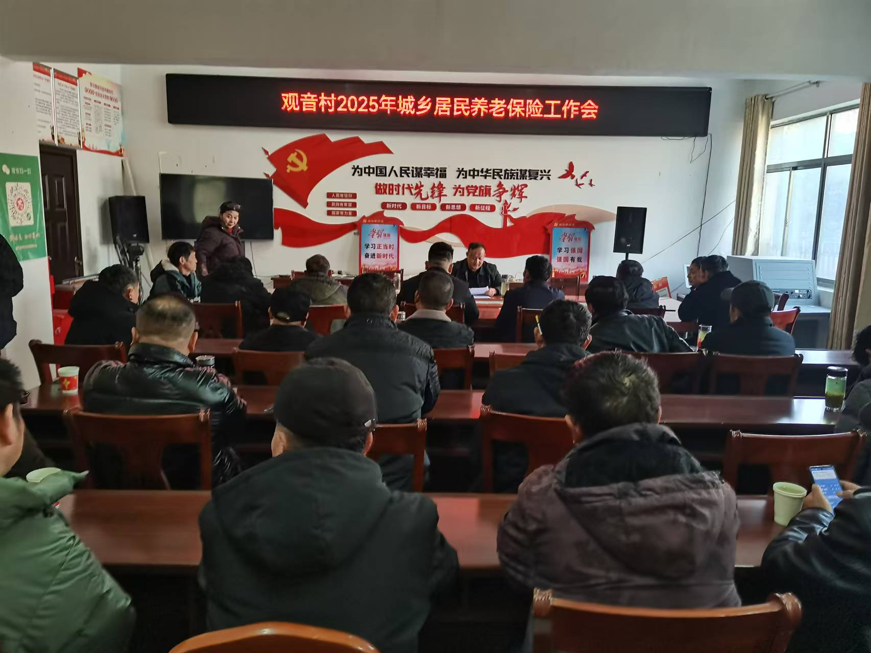 1月8日,观音村召开城乡居民基本养老保险工作推进会,村工作人员、村民代表参加会议。