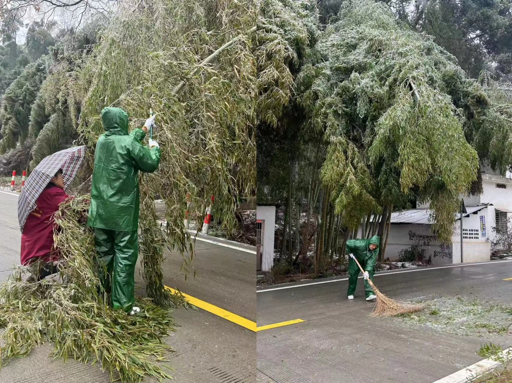 近日来,由于低温雨雪冰冻天气持续出现。九龙村S246省道上多处树枝被冰雪压断、压塌,严重阻拦了交通要道,给群众出行带来了极大的不便。九龙村“两委”干部、驻村工作队闻令而动,积极组织志愿者们共同开展道路清障工作,确保群众出行安全。