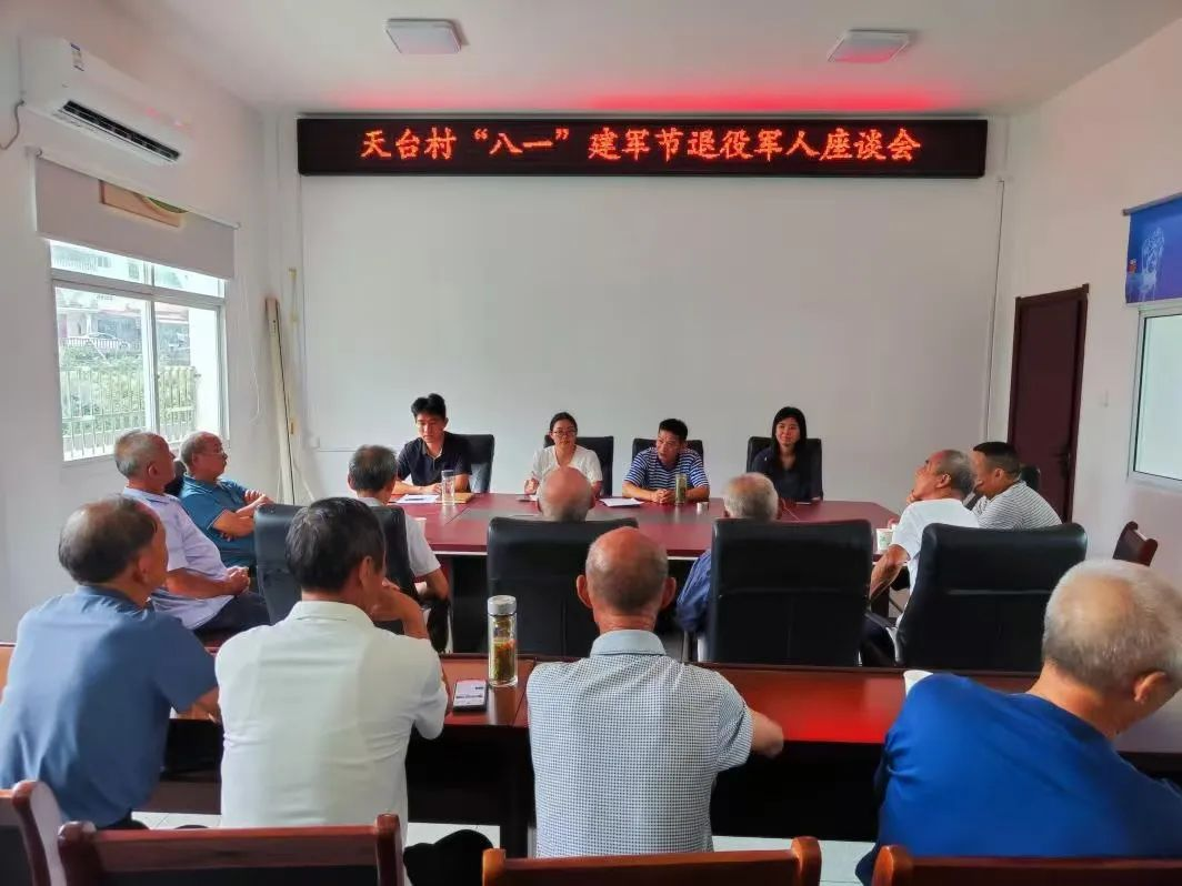 在中国人民解放军建军98年之际,天台村联合村退役军人服务站组织召开“八一”建军节退役军人座谈会,向全村退役军人致以崇高敬意与节日问候。村“两委”干部、驻村工作队成员以及部分退役军人齐聚一堂,共忆军旅荣光,畅叙鱼水情深。