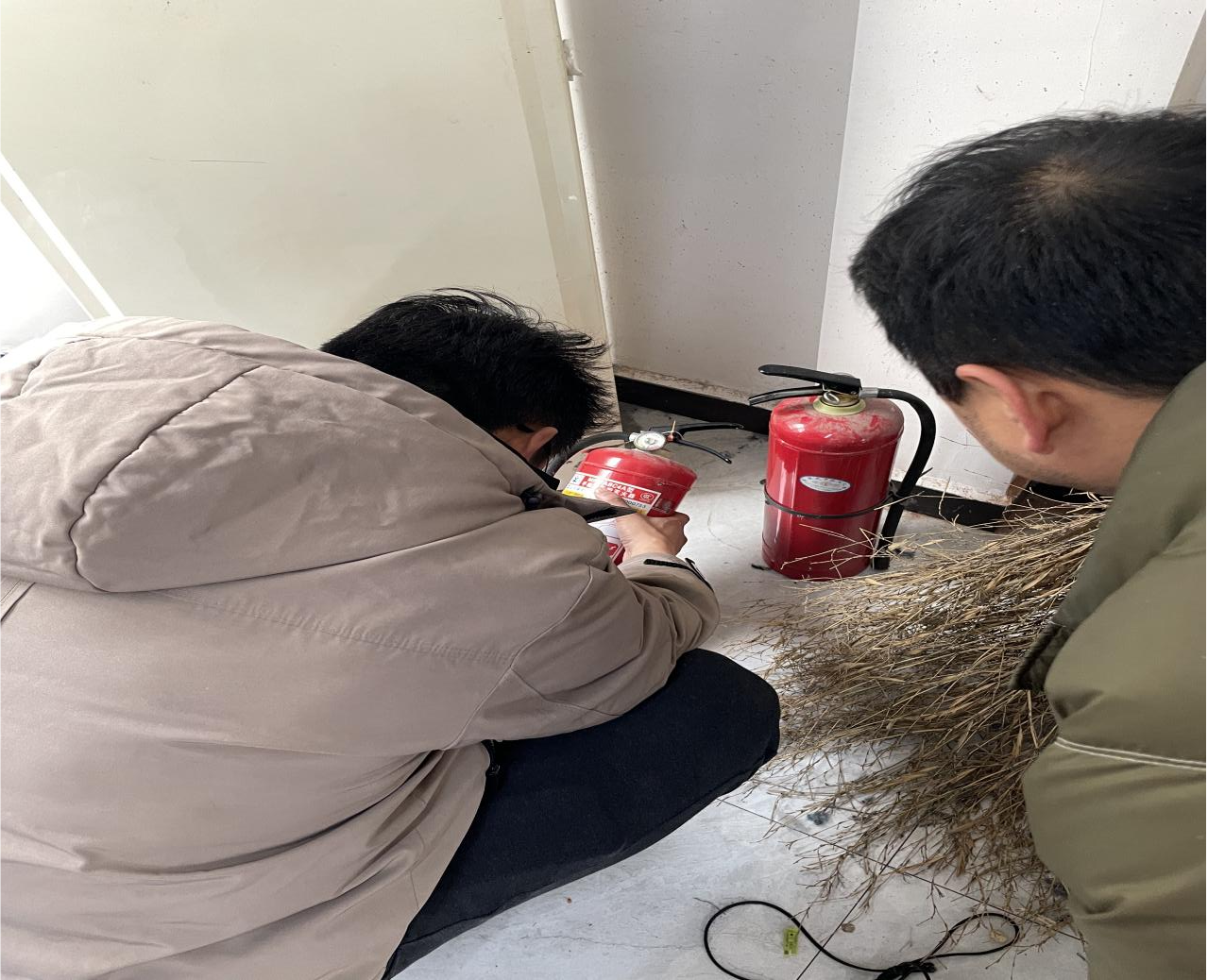 1月11日,刘羊村工作人员到辖区内的服装加工厂进行消防安全巡查,查看灭火器有效期以及摆放位置是否合理。