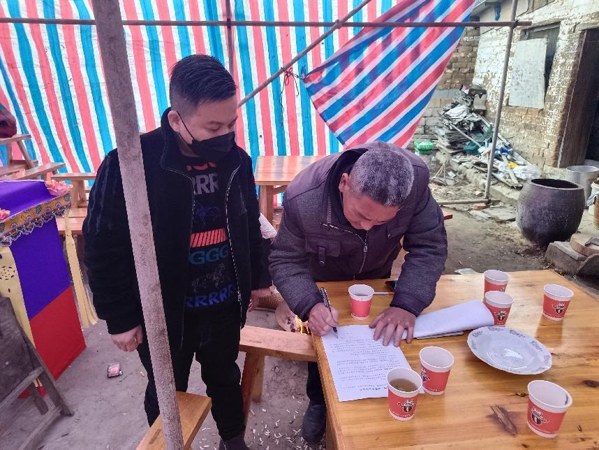 1月3日,阳冲村工作人员上门签订移风易俗承诺书,叮嘱丧户注意做好疫情防控措施,戴好口罩,做好消杀工作。丧户们积极配合,签订了承诺书,表示会做好防疫措施。