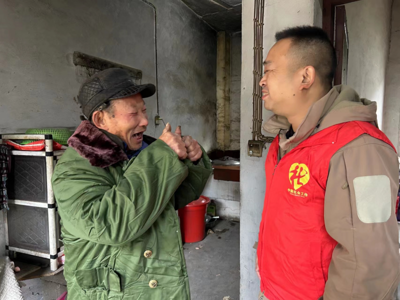 12月17日,阳冲村社工志愿者上门给孤寡老人送棉被和大衣。
