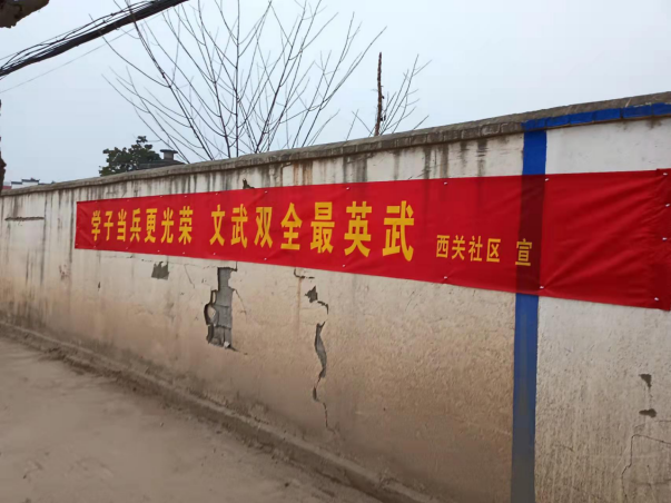 为扎实做好2023年春季征兵工作,积极动员广大适龄青年踊跃报名参军,西关社区立足早宣传、早动员,夯实征兵基础,高标准、高质量完成征兵工作。1月9日西关社区通过大喇叭广播循环播放征兵通知、入户走访、张贴宣传标语等方式宣传征兵政策和要求,积极营造“一人当兵,全家为荣”的浓厚氛围。