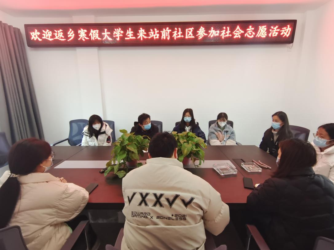 1月12日,站前社区在会议室召开“欢迎返乡大学生来站前参加社区志愿活动”会议?;嵘?,社区书记向大学生志愿者介绍了本次活动,站前社区的基本情况以及工作内容等,并对志愿者表示热烈的欢迎。