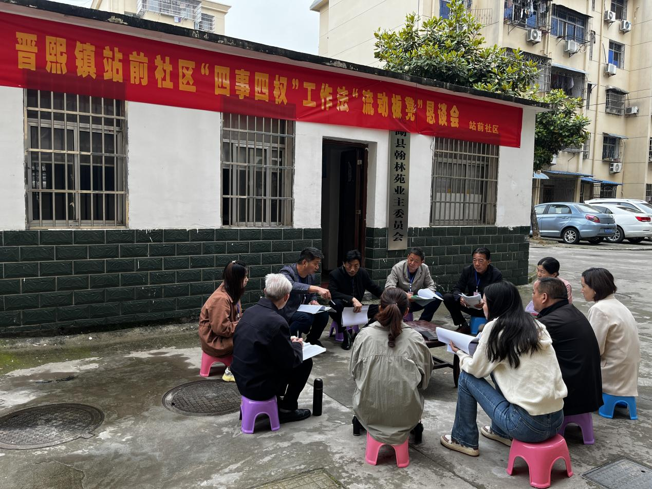 自“四事四权”工作法推行以来,站前社区高度重视、迅速行动,积极发挥红色物业作用。动员社区党员干部、“五老”人员、“网格员”、青年志愿者等,常态化开展“板凳恳谈会”。目前站前社区划分为4个网格,选优配齐网格员85人。制定了“四事四权”需求清单,积极健全“五老”队伍建设。成立了业主委员会,红色物业积极引导群众“有事找网格,做到“小事不出网格,大事不出社区”。