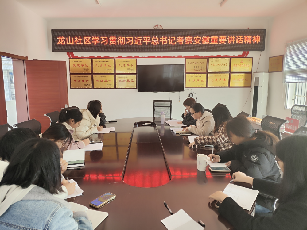 为深入学习贯彻习近平总书记考察安徽重要讲话精神,近日,龙山社区积极组织全体工作人员开展专题学习会,在社区内掀起了一股学习热潮。