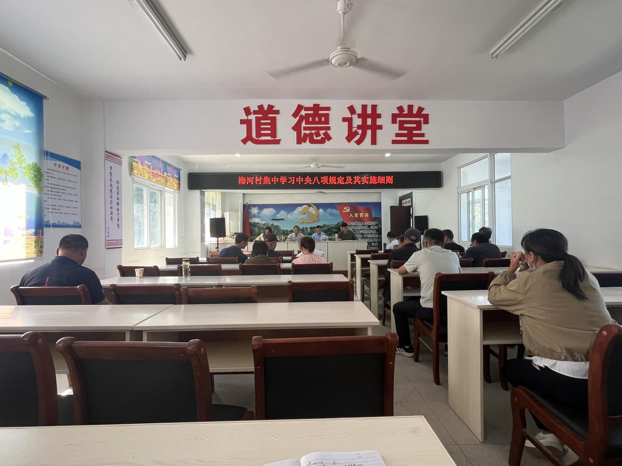 5月29日,梅河村党支部组织党员集中学习中央八项规定及其实施细则精神。