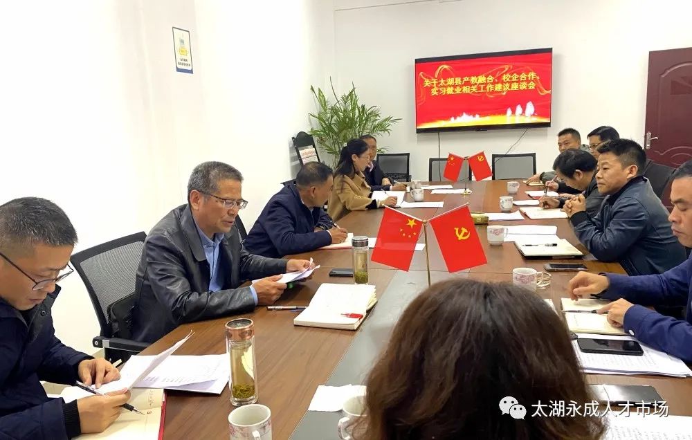 close11月28日下午,太湖县关于产教融合、校企合作、实习就业相关工作座谈会在县永成人才市场召开。县开发区管委会副主任查乐平,县组织部副部长、人社局长张文斌,太湖职业技术学校校长周玲,技工学校校长王平以及相关领导,永成人才市场董事长章永康出席会议?;嵋榫臀蚁刂耙到逃谷绾挝钡仄笠涤霉び殴ぷ鞣⒄棺鲇辛χС耪箍致?。经过近两个小时的研究,大家就我县产教融合、校企合作、实习就业目前存在的问题,后续解决方案形成了基本思路。把工作做细做实,为太湖县经济发展和制造业迈向新的高度贡献职教力量。